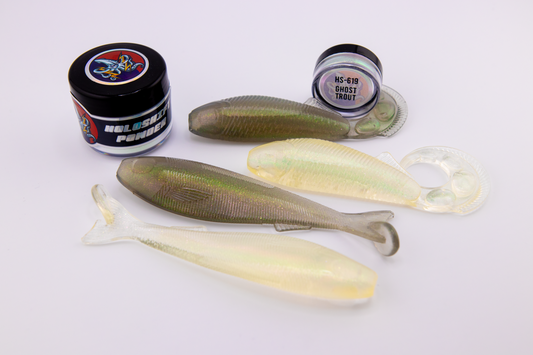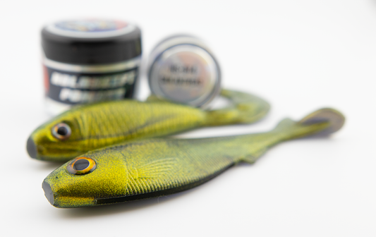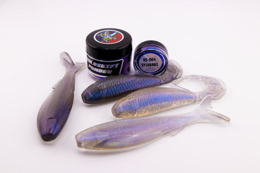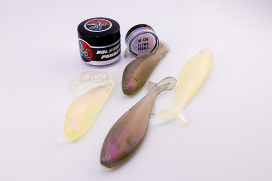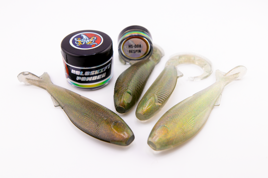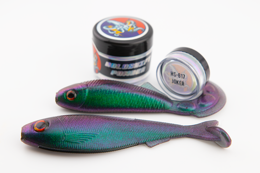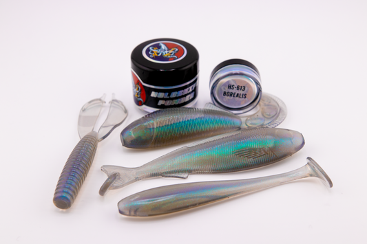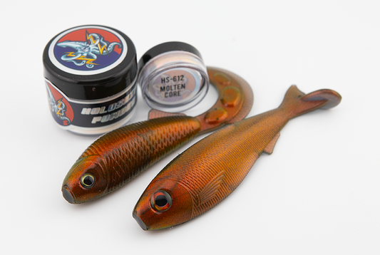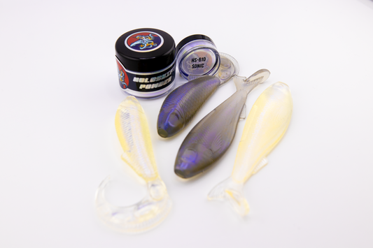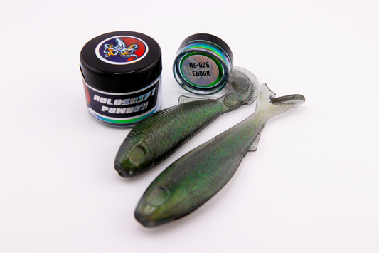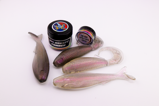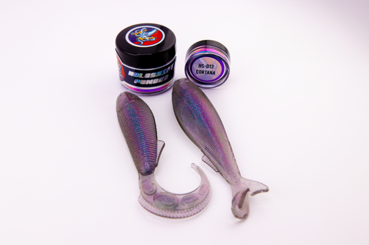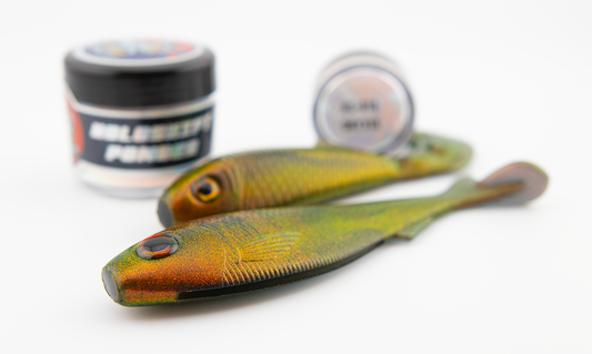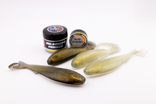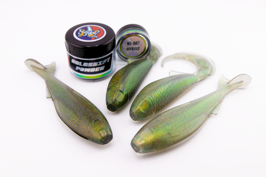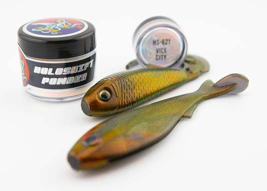 Holoshift Powders by 8bit Baits are SiO2 Silica based color shifting powder pigments designed for use in a variety of applications. Holoshift Powder is able to to be mixed into plastisol for soft plastic injection, safe for use in epoxy and resin clear coats, and the incredibly small particle size of 40 microns makes it compatible with airbrush applications as well. Holoshift Powder is also optically clear, so when used in soft plastic injection applications, the powder will visibly disappear at certain angles adding a 3rd dimension to the visible effects created in the baits.