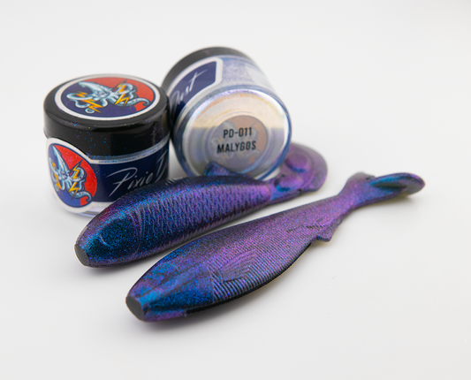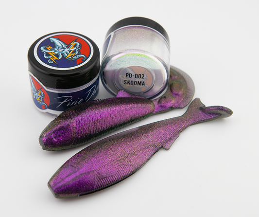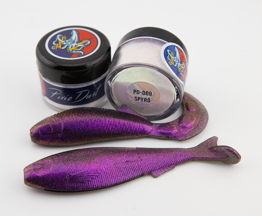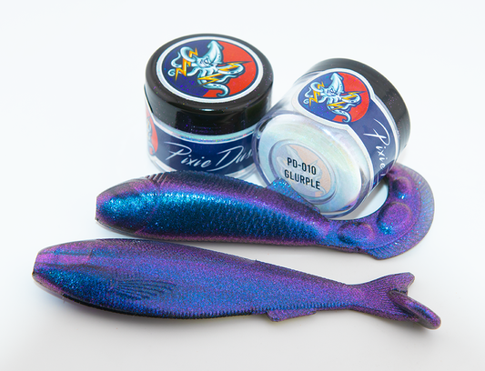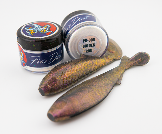 Pixie Dust by 8bit Baits are Borosilicate based color shifting powder pigments designed for use in a variety of applications. Pixie Dust Powder Pigments are able to to be mixed into plastisol for soft plastic injection, safe for use in epoxy and resin clear coats, and the incredibly small particle size of 50 - 150 microns makes it compatible with airbrush applications as well. Pixie Dust should be treated similar to a pearl powder. It is not optically clear which means it will cloud the plastisol similar to a pearl powder. It can still be used in clear belly applications but can also be used added to a wide range of base colors. Pixie Dust have a very high level of reflectivity and glimmer which look fantastic not only in sunlight but also in low light situations.
