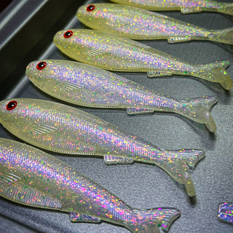 Siren Scales are silica based which gives them many benefits over traditional Polyester glitter. The flakes have high heat resistance so they will not burn or degrade when mixing into hot plastisol, and they can withstand multiple re-heats. Siren Scales can also withstand high heat for long periods of time, making them ideal for use in commercial bait making applications. The silica base also provides the highest quality level of "shimmer" compared to polyester glitter, which is very noticeable in low light environments.