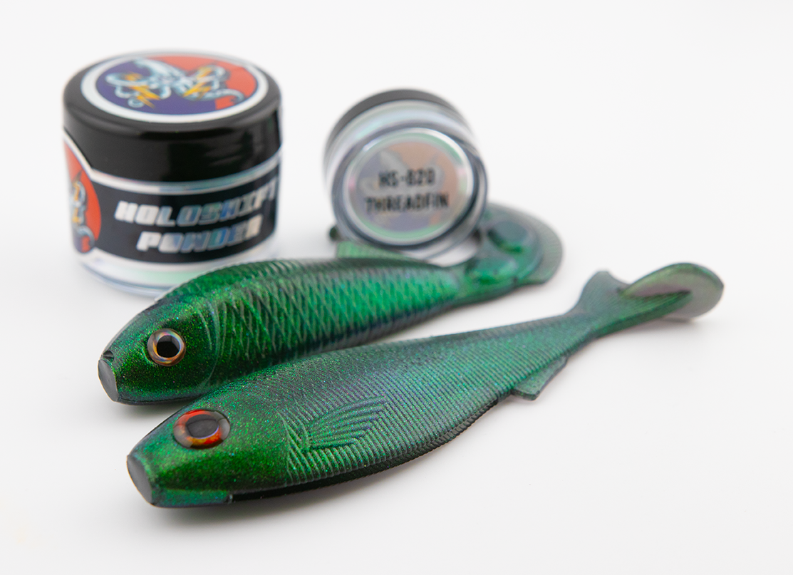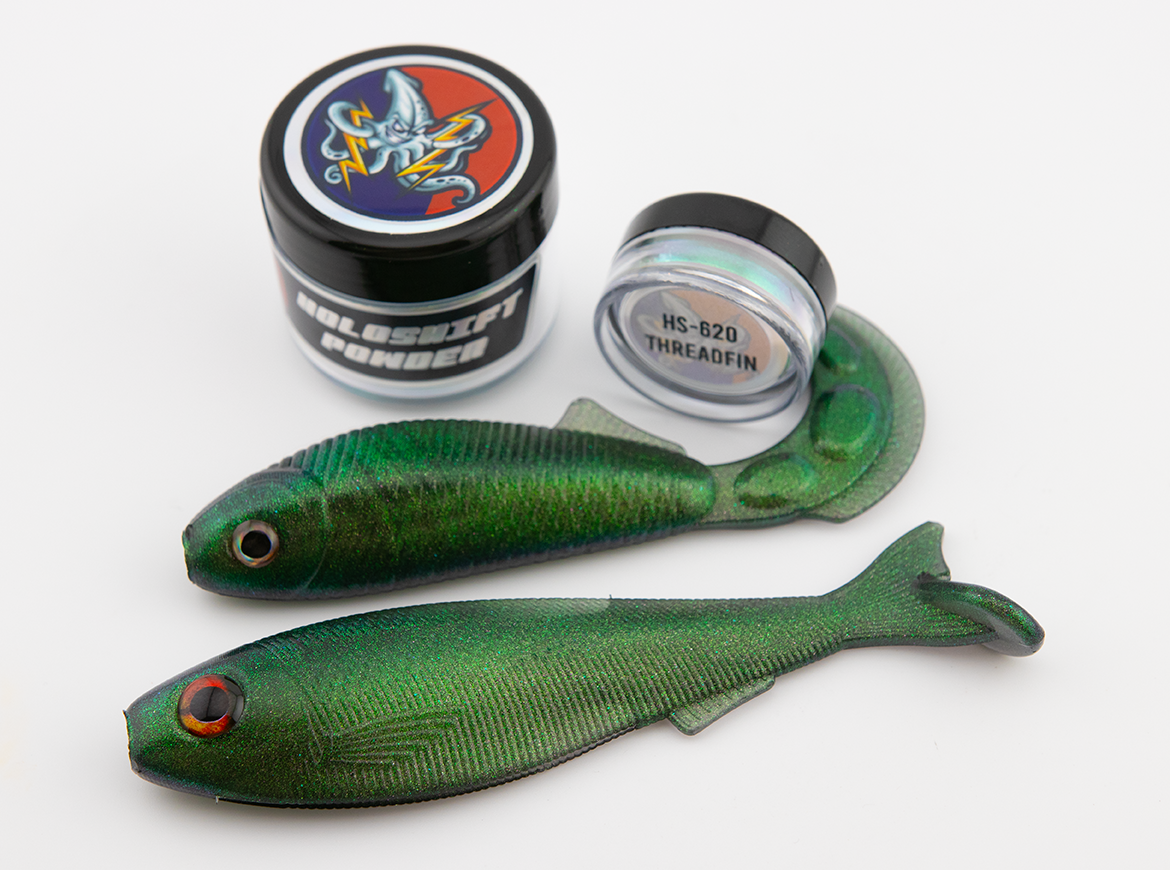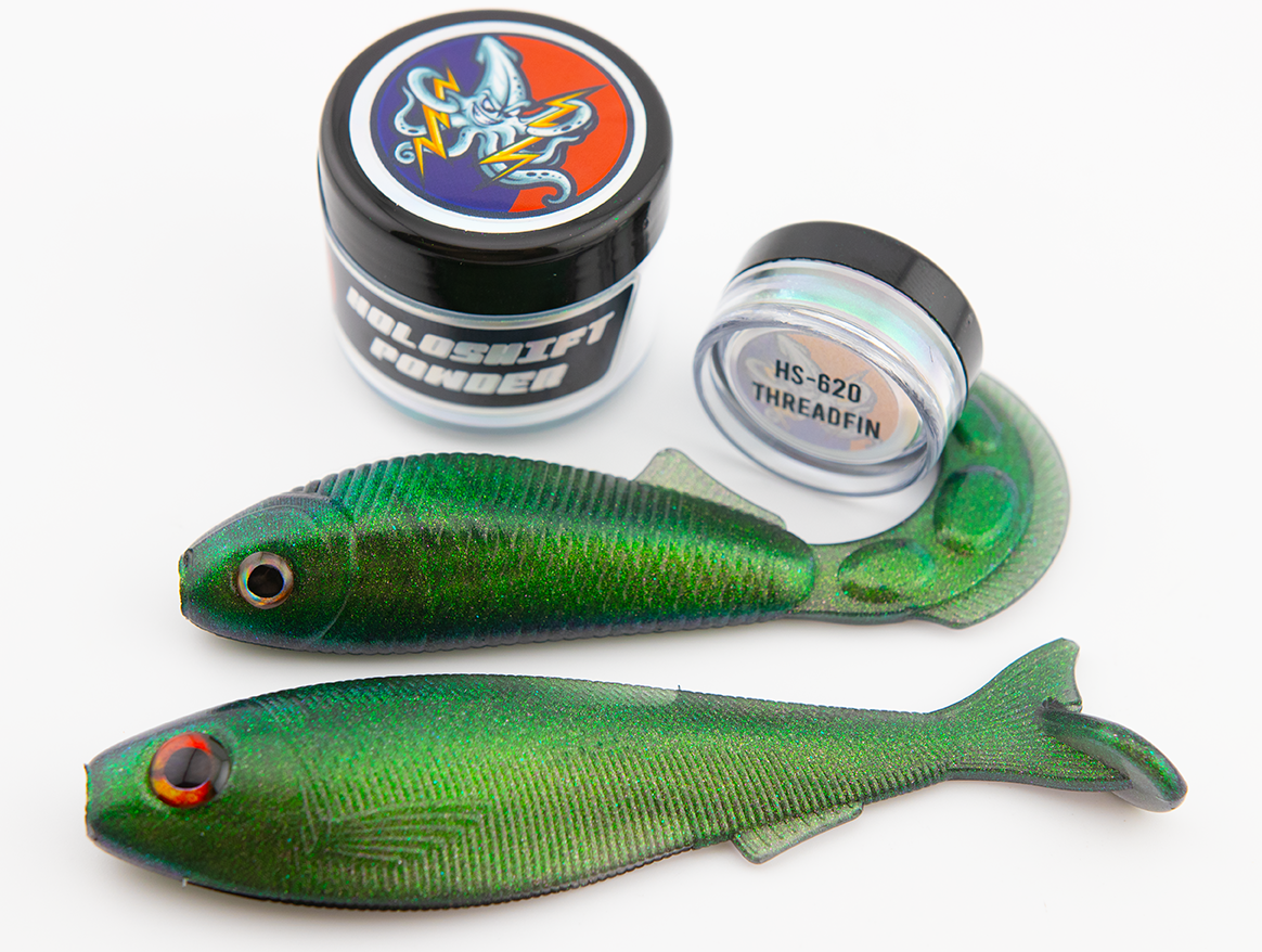 Holoshift Powders by 8bit Baits are SiO2 Silica based color shifting powder pigments designed for use in a variety of applications. Holoshift Powder is able to to be mixed into plastisol for soft plastic injection, safe for use in epoxy and resin clear coats, and the incredibly small particle size of 40 microns makes it compatible with airbrush applications as well. Holoshift Powder is also optically clear, so when used in soft plastic injection applications, the powder will visibly disappear at certain angles adding a 3rd dimension to the visible effects created in the baits.