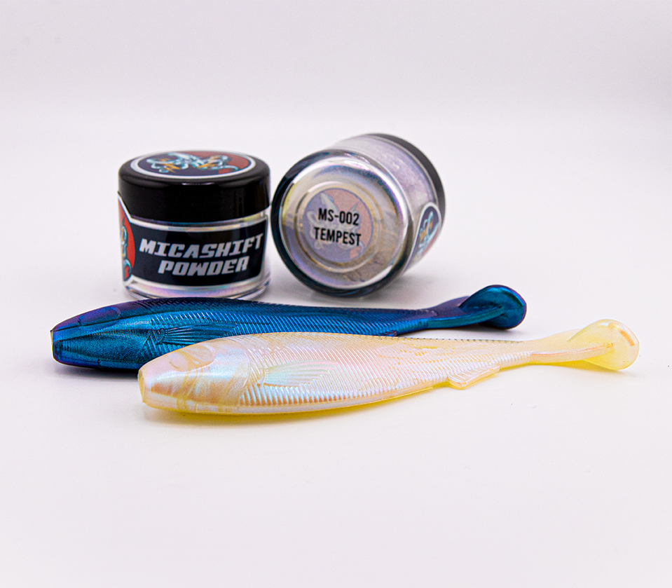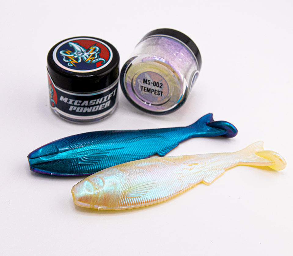 Micashift Powder by 8bit Baits are Mica based color shifting powder pigments designed for use in a variety of applications. Micashift Powder Interference Pearls are able to to be mixed into plastisol for soft plastic injection, safe for use in epoxy and resin clear coats, and the incredibly small particle size of 10 - 60 microns makes it compatible with airbrush applications as well. Interference Pearls should be used in a similar fashion to a highlight powder. They are not optically clear which means they can "cloud" or opaque the plastisol depending on the amount used. Interference Pearls can still be used in clear belly applications in small amounts without much opaqueness, but they can also be used added to a wide range of base colors. Micashift Powder Interference Pearls have a very high level of vibrancy which looks fantastic not only in sunlight but also in the water.