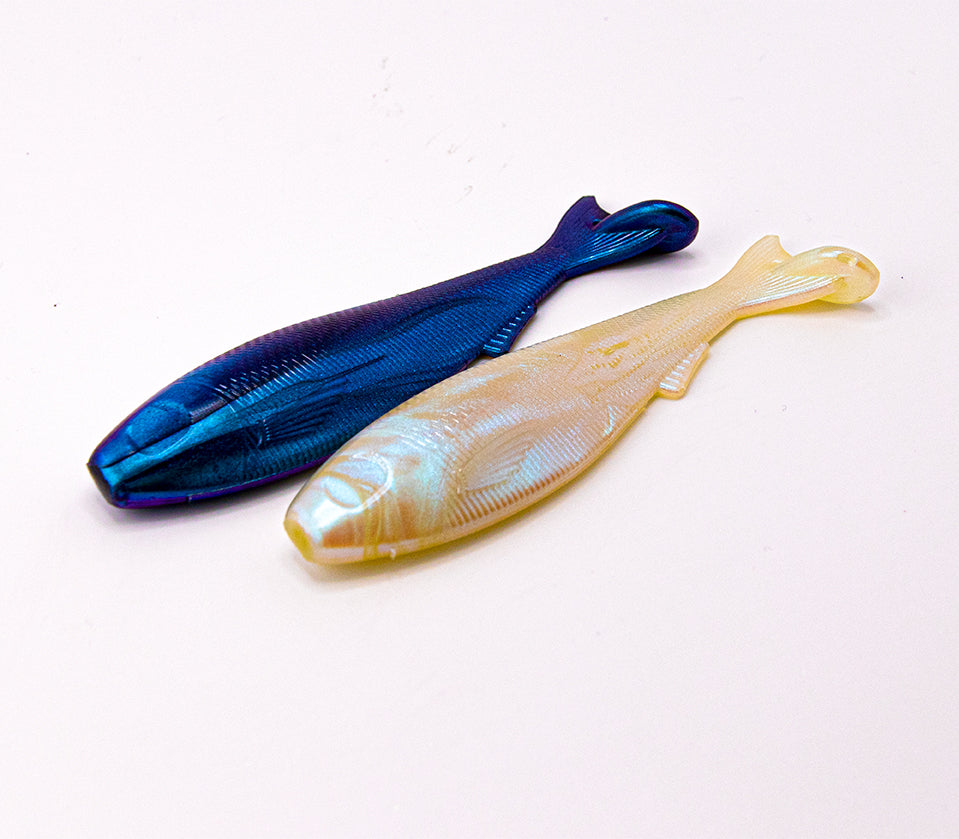 Example baits shown are made using 1 cup of plastisol and 1/4 tsp of Micashift Powder. One example is shown in clear plastisol and the other example is shown with 20 drops of Lureworks Black Plastisol Colorant added.