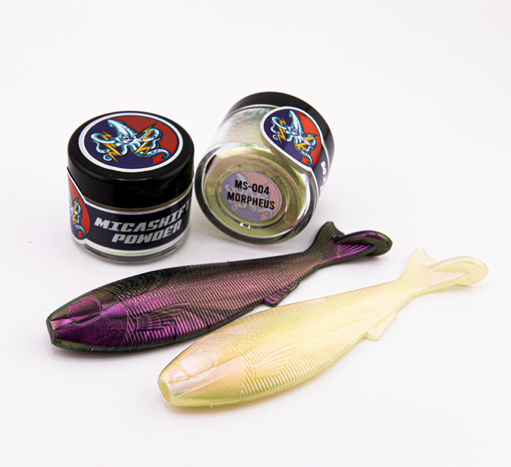 Micashift Powder by 8bit Baits are Mica based color shifting powder pigments designed for use in a variety of applications. Micashift Powder Interference Pearls are able to to be mixed into plastisol for soft plastic injection, safe for use in epoxy and resin clear coats, and the incredibly small particle size of 10 - 60 microns makes it compatible with airbrush applications as well. Interference Pearls should be used in a similar fashion to a highlight powder. They are not optically clear which means they can "cloud" or opaque the plastisol depending on the amount used. Interference Pearls can still be used in clear belly applications in small amounts without much opaqueness, but they can also be used added to a wide range of base colors. Micashift Powder Interference Pearls have a very high level of vibrancy which looks fantastic not only in sunlight but also in the water.