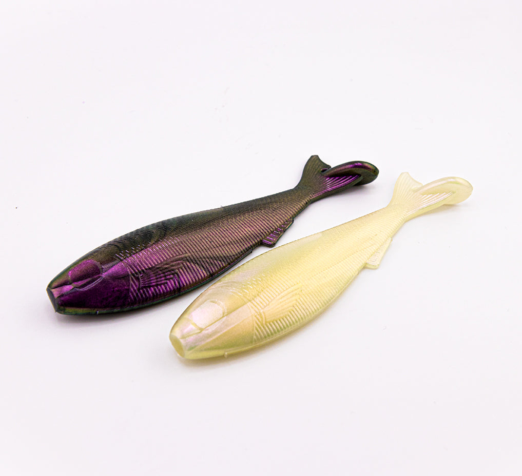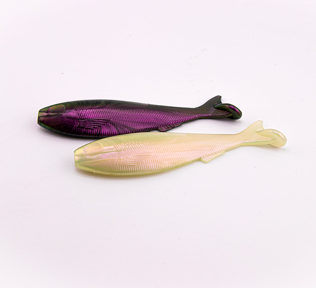 Example baits shown are made using 1 cup of plastisol and 1/4 tsp of Micashift Powder. One example is shown in clear plastisol and the other example is shown with 20 drops of Lureworks Black Plastisol Colorant added.