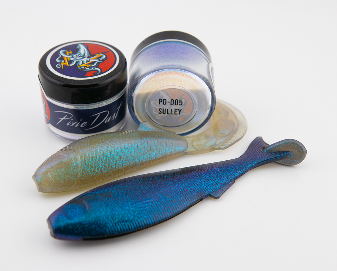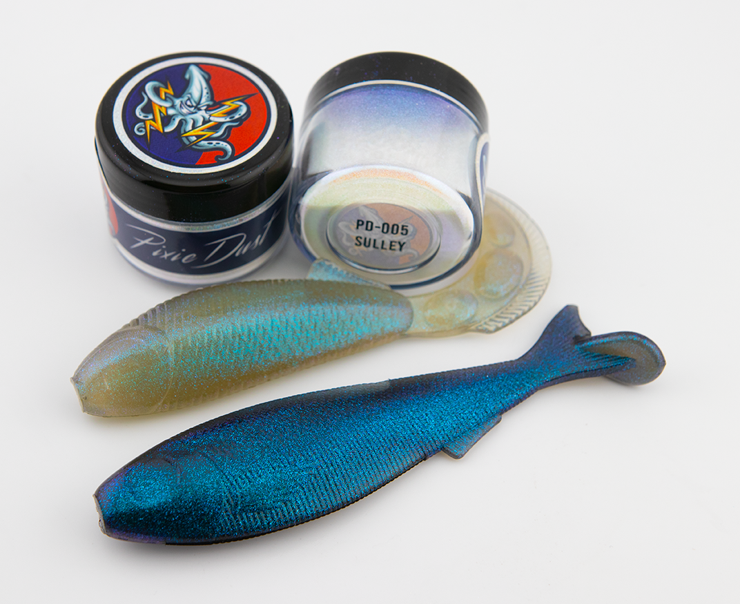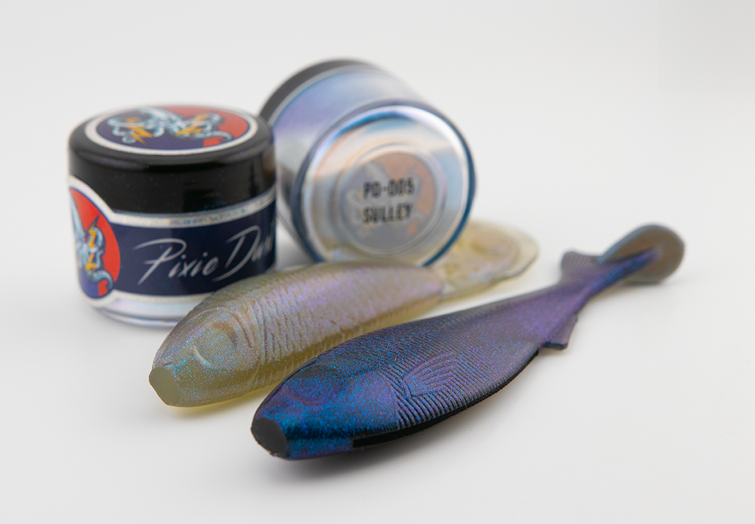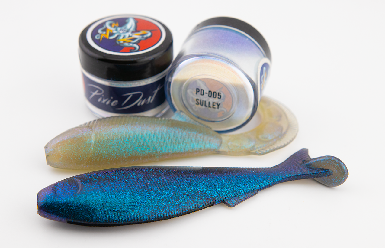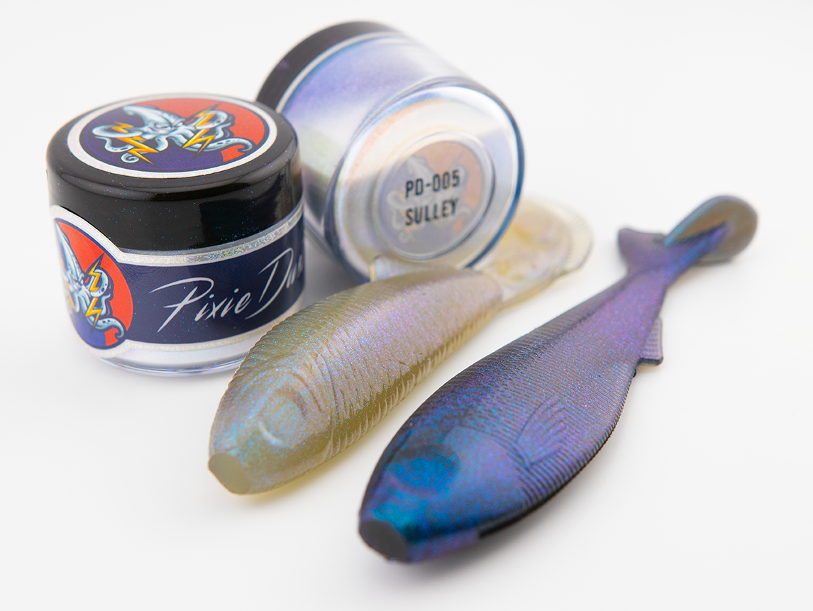 Pixie Dust by 8bit Baits are Borosilicate based color shifting powder pigments designed for use in a variety of applications. Pixie Dust Powder Pigments are able to to be mixed into plastisol for soft plastic injection, safe for use in epoxy and resin clear coats, and the incredibly small particle size of 50 - 150 microns makes it compatible with airbrush applications as well. Pixie Dust should be treated similar to a pearl powder. It is not optically clear which means it will cloud the plastisol similar to a pearl powder. It can still be used in clear belly applications but can also be used added to a wide range of base colors. Pixie Dust have a very high level of reflectivity and glimmer which look fantastic not only in sunlight but also in low light situations.